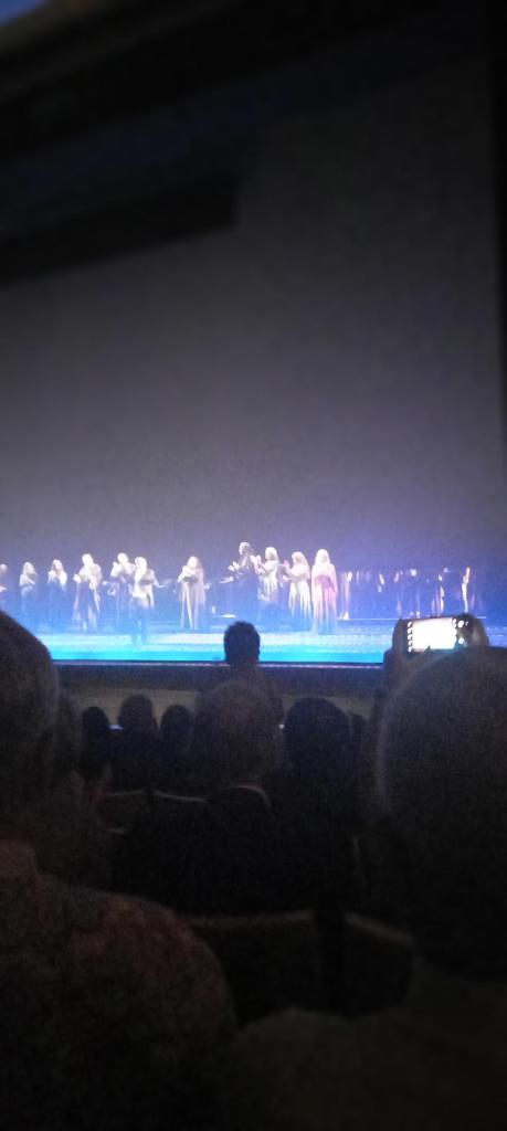 This was not one of those Wagner productions which seek to completely retell the story (the Berlin one set in a prison, and a recent Vienna one as well, I think) and was, with a few quirks, actually fairly traditional (it dates from 2006) and even on a few occasions seemed to refer back to Wieland Wagner’s Bayreuth production – for instance there is a backdrop of tree shapes in Act 1 Scene 1 which reminded me of that production, as well as Gurnemanz and the Knights /pages in that scene also looking Wieland-esque in long coats. The unchanging element in the set was a front gauze curtain which allowed some effective images but did make things murky and fuzzy at times, together with some very selective lighting on characters on the stage – particularly Klingsor, whose face was more or less completely blurred. There seemed to be writing on the steps at the front of the stage that was, maybe intentionally, undecipherable. The gauze curtain was underlit in blue for Acts 1 and 3 (though Act 3 Scene 1 was without the writing, and the writing, I think, disappeared during Act 3 scene 2). I had no clue what this writing was but somebody told me it’s actually a register of Grail knight. If so it plays no part in the action. The blue colour is still there in Act 2 but there are shifts towards slightly more emphasis on yellows and reds. There is move to green and blue in Act 3 scene 1 and then back to blue for the final scene. The stage is fairly bare but in the Grail temple there’s no chalice as such but an enormous circular flower-patterned window which, when Amfortas sends a signal with some sort of magic mirror (almost like an ipad!), opens up to reveal a kind of whirling conical shaped vortex constantly changing colours in Act 1, appearing at the furthest-away point of which is a pattern of red and white (maybe a few more colours) changing shapes. In Act 3, the vortex doesn’t whirl and instead there’s a much larger hologram not unlike a diamond – maybe a dodecahedron – possibly a reference back the medieval legends where the Grail is a magic stone. In Act 2, there is the same whirling vortex, but without the image at its centre – presumably as a kind of parallel to the temple – and on stage left high up is a suspended enormous spear, pointing downwards. For once the climax of Act 2 has a spear doing something,…. it moves upwards towards Parsifal. The knights in Act 1 scene 2 seem distant, (it’s not easy to see their faces) and almost automatons, with huge shields. It’s almost shocking when they move to close in on Amfortas in Act 3 scene 2 and threaten him. The most wayward part of the production is that at the beginning of Act 3 Scene 1 you see in addition to a withered tree a clump of about 50 shapes under white shrouds. During the Good Friday music Kundry gradually unwraps them – I thought at first, with a cringe of horror, that they were meant to be ‘new buds’ of some kind but realised afterwards that actually they are all in Buddha imagery. The sight of Kundry messing around with these shrouds is very distracting during some of Wagner’s most glorious music. On the other hand, the best part of the production is the handling of the end, which, as the vortex remains calm and the dodecahedron floats, has Amfortas and Kundry facing each other in redeemed love, with a solitary Parsifal almost within the vortex. This is a beautiful way of depicting on stage what is happening in the music. Parsifal has an odd costume in Acts 1 and 2 – a bit like a Pakistani peasant with baggy shalwar trousers. Kundry had a very unflattering dress, which she should have put her foot down about – Ms Pankratova looked much more seductive in the hammam in the Bayreuth production.