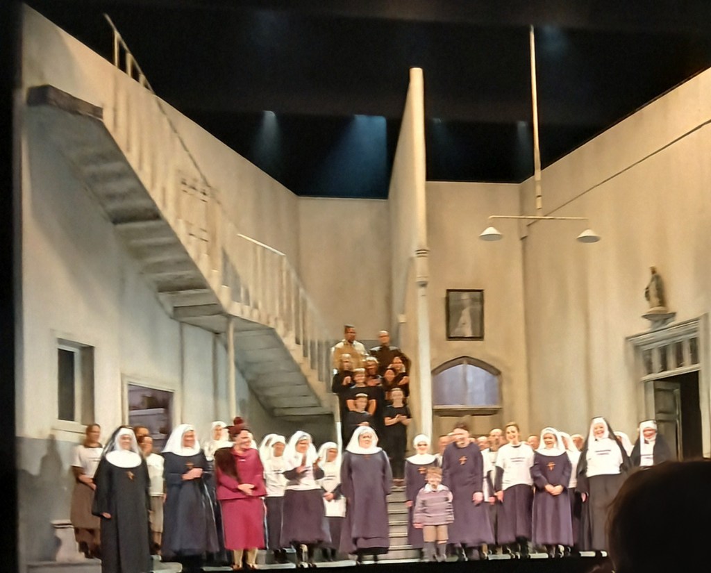 The sets for the three were all different but straightforward and realistic – a Parisian canal, a convent and a sitting room. The photos below offer a reasonable view of them. For the first two works costumes were vaguely contemporary with the pieces’ genesis – 1910s – or maybe a bit later., 1920’s. For some unclear reason, Gianni Schicchi was set in the early 1970’s but this wasn’t a huge distraction. All three were extraordinarily detailed in terms of props – the convent had a faded black and white photo of a long-forgotten pope or cardinal for instance and felt exactly like the convent I used to live in (that story is for another time), while the Gianni Schicchi props included splendid 70’s lampshades, handbags, dresses and antique TV. McVicar’s (and the revival director’s) handling of people on stage was deft at all times, fully in line with the needs of verismo, and memorable.