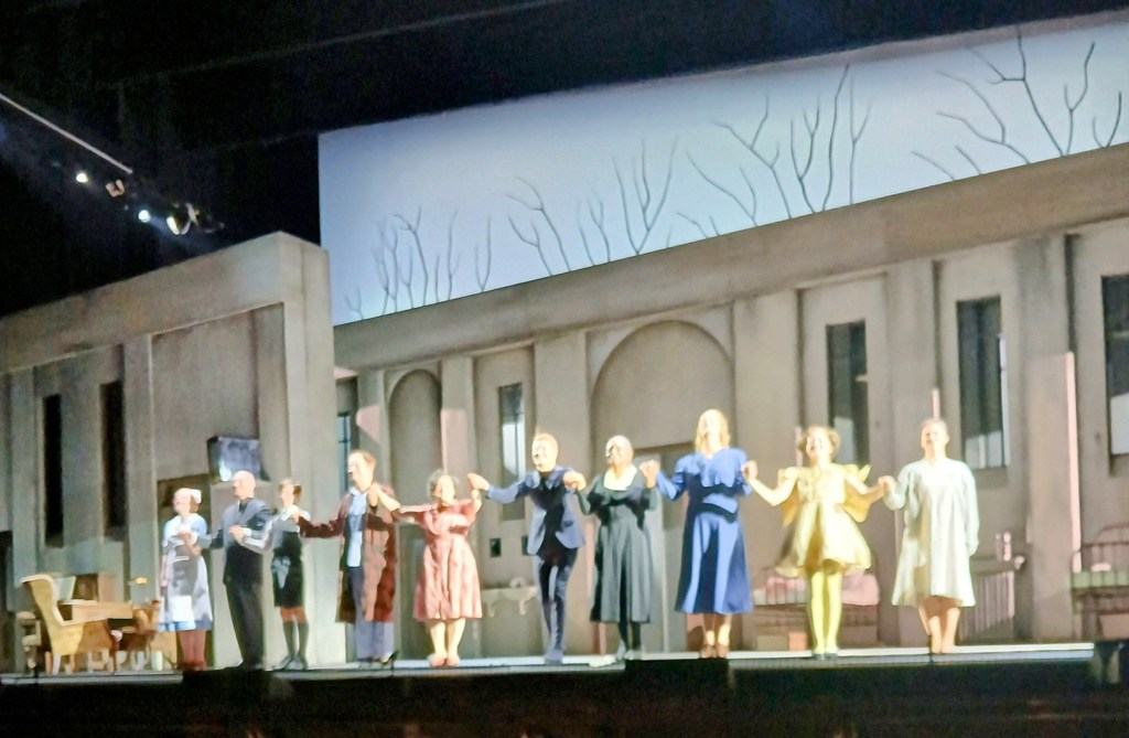 The scenery was the same throughout – two flats, one moveable, representing walls of the country house which shifted cleverly to different parts of the stage, and some furniture – two beds, a desk, a lampshade, and armchairs. Above the walls, but never fully revealed, are stark bare branches sticking up into the sky, maybe representing the sterility of the Governess’ incarceration – by contrast the (I think entirely) black and white videos are full of luxuriant foliage and beautiful interiors, again feeling like remembered images. I thought this was all very effective – and the sets, as you can see from the photo below, also have the effect of cutting off the back of this large stage and making it easier for the singers to project into the audience.
