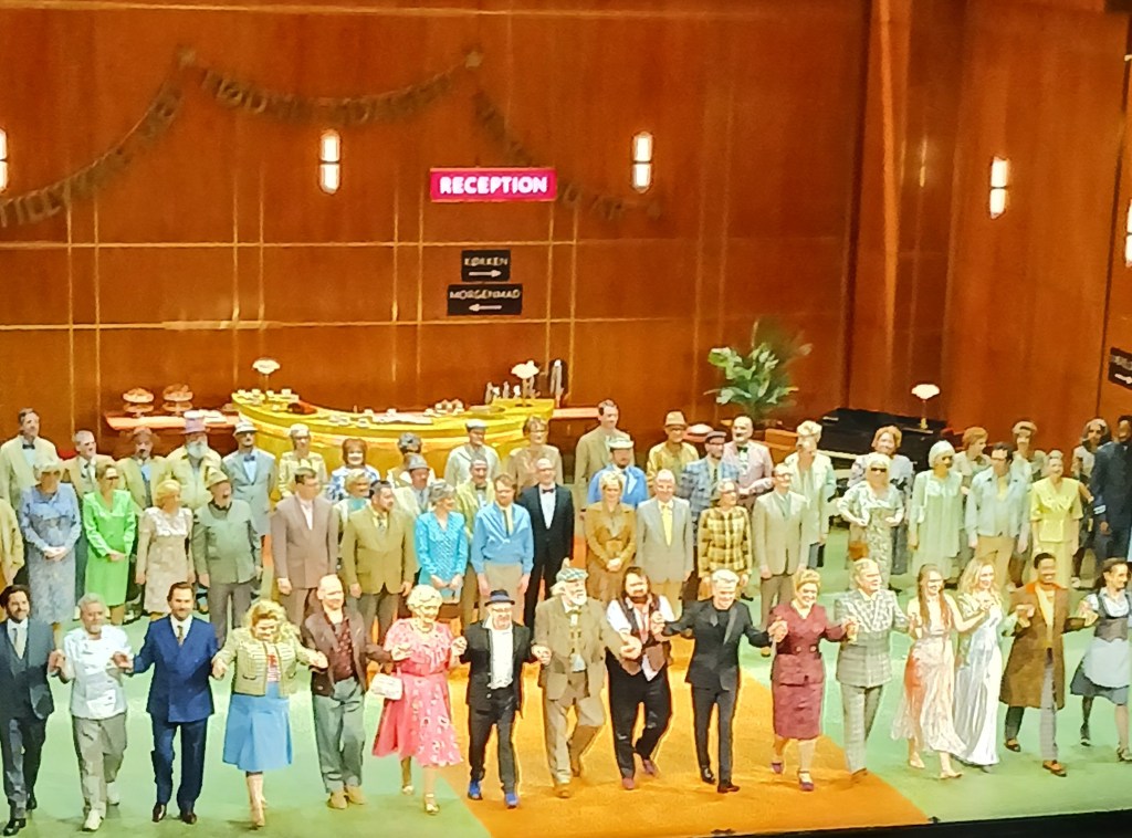 The production was very effective in moving a large chorus and a very large cast deftly around the stage. The chorus of family members was well characterised so that each seemed an individual, and there was little that looked artificial in the way they moved. The hotel reception area as in the photo doubled as the main dining area for speeches; there was then via dropped screens a split stage area appearing for scenes with individual characters and groupings . Richard Jones I always find to be effective but this must be one of his best shows.