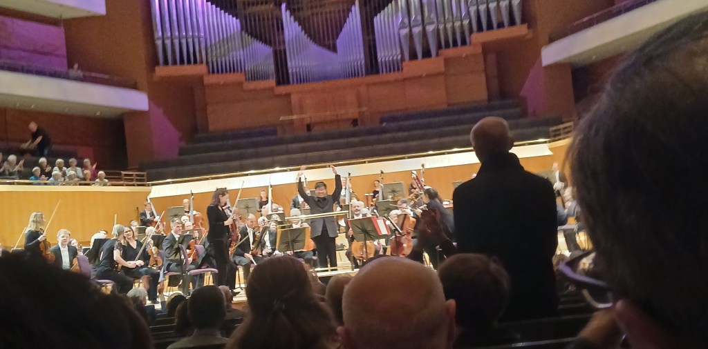 The performance of the Brahms 1 was very impressive. I have not heard a better live one in a long time. It was serious, solid and sensitive, and it didn’t rely on flashy dynamism but seemed to grow organically. The disposition of the orchestra was interesting – split violins, 8 double basses at the back, 5 horns, and timpani to the side at a lower level. This created a rich deep sound – chords emerged from a deep bass. The first movement was taken relatively slowly so that the dotted note rhythms and angular punchy phrases made their full impact. The build up to the recapitulation in the first movement was tremendous in its power. The second movement was relatively fast and light but still very touching – the woodwind excelling themselves here and in the 3rd movement. The last movement was excellent – wonderful horn playing in their big tune, and a hugely impressive slow rendition of the big chorale tune at the end. There were many memorable moments in this movement – I particularly recall the moment towards the end when the horns play their big tune for the last time, where the music dies down slowly and movingly, which was very beautifully and lingeringly played, and the moment about 2 minutes further on when the orchestra slowly but inexorably picks up speed at the start of the coda, which was very exciting indeed. Throughout the Halle sounded wonderful. I really do think the Halle has made an excellent choice in Mr Wong – I hope he stays………….