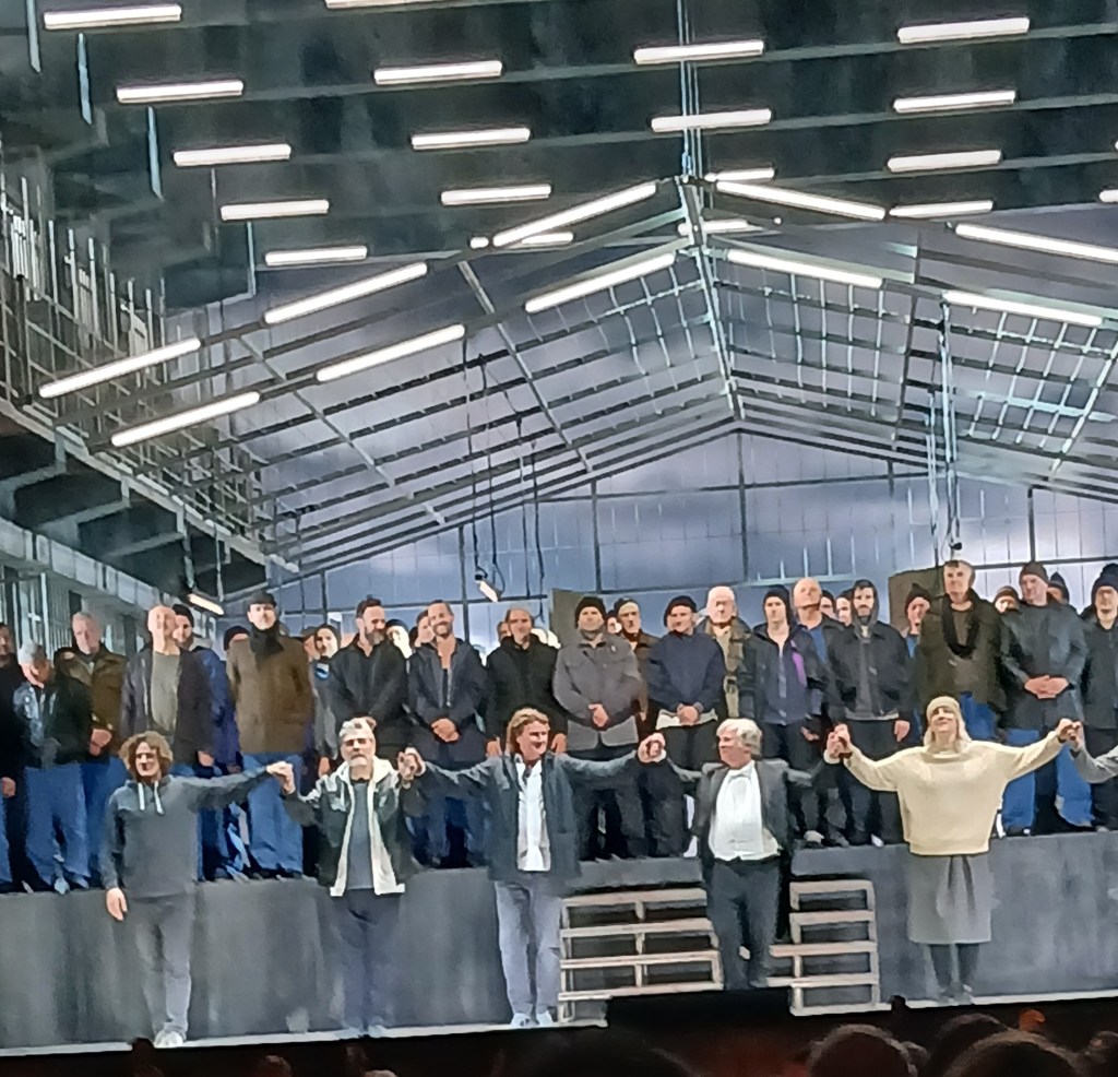 The sets all worked well – the first a moveable mesh of prison bars that had spaces looking like individual cells, entirely grey in colour and with prisoners in blacks, greys and dark blues. The second act – photo below before the start of Act 2 – is a modern shiny office, with a kitsch strip-lit cross which the young Parsifal is required to pose against with arms outstretched. The third act – as seen in the curtain call photo below – is a part-deconstructed prison with block-like tables (the prison has been decommissioned but some of the prisoners have stayed on, according to Serebrennokov’s programme notes). Above the set in all three acts are three screens showing a range of images, many of them apparently shot near Moscow. There are scenes of an abandoned church, an abandoned prison-like building, and lots of images of men looking like prisoners, sometimes with homo-erotic suggestion, sometimes with religious tattoos of chalice, spear and cross (suggesting that there is a need for faith in someone or something among the prisoners). This is where we see the albino-like swan prisoner who is killed by young Parsifal.