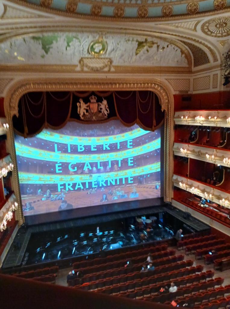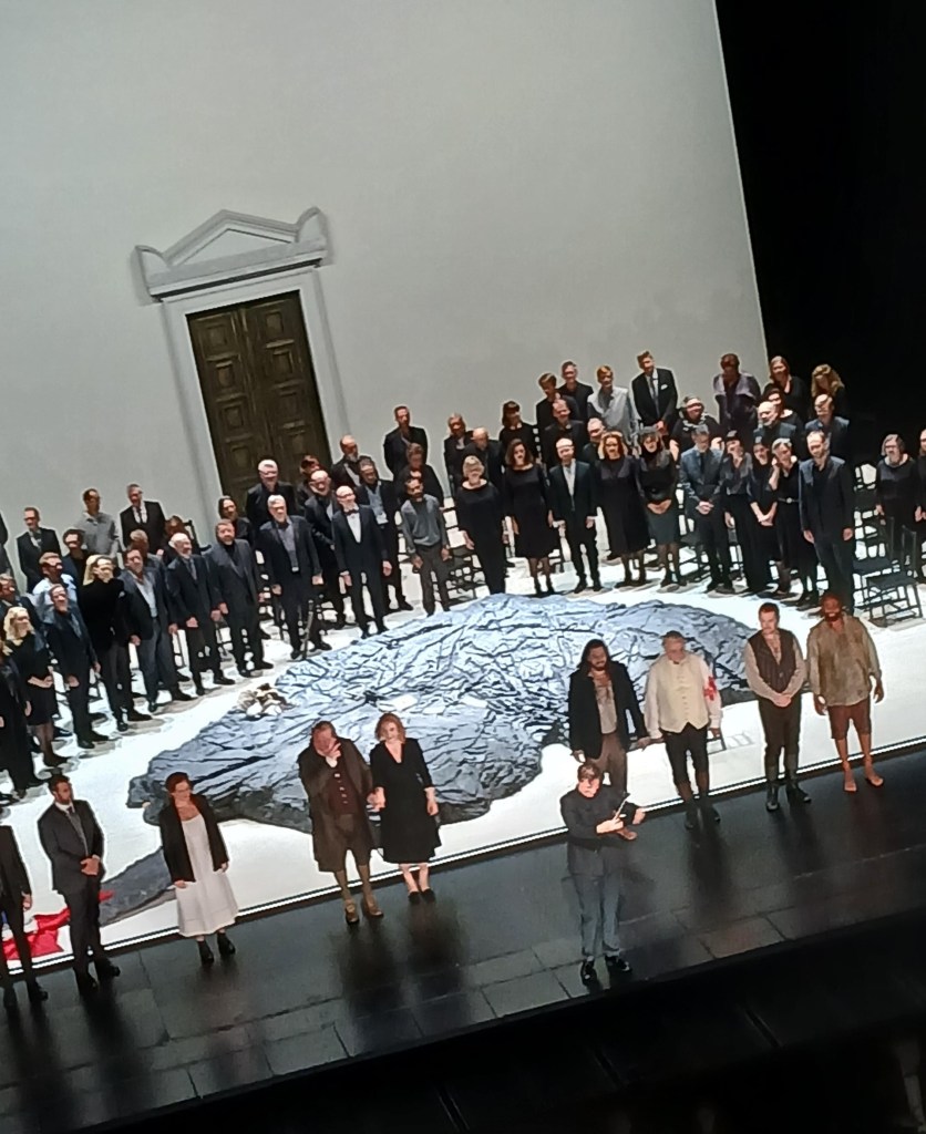 I think anyone who has done any reading up about this work will know that Fidelio is a problematic opera to stage – the contrast between the singspiel elements in Act 1 and the heroics of Act 2, and the rather ludicrous romantic attachment Marzelline has for ‘Fidelio’ are only two of the difficult issues to deal with. Kratzer has a better go at some of the problems than other productions I have seen – but of course that’s not saying very much. One central extra issue of this production though is the difference between the approaches to the first and second acts. There are some connections – the screen facing the audience when they arrive has the revolutionary slogans of ‘Liberte, fraternite, equalite’ , and with a camera showing the audience arriving. Clearly we are intended as an audience to reflect on what these slogans mean for us, and that connects to the second act. In both acts Marzelline is given a much more upfront role than usual – see below. And in both acts Kratzer adds some spoken dialogue not in the original. The way Leonora/Pizarro/Rocco/Marzelline look/dress is the same in both acts (though Don Fernando is in modern dress). But there are also huge differences between the two acts. In the first Kratzer updates the setting of the opera to Beethoven’s time and it is evident, with French flags, that a revolution has become a dictatorship. As indicated, the first act is handled in a highly realistic way, complete with Pizarro arriving on a horse, and sturdy prison walls, plus a slightly postmodern looking tree. However there are a number of directorial glosses and interventions – Jacquino is rather creepy and over-assertive, Marzelline discovers fairly early on that ‘Fidelio’ is female and becomes thereafter a willing accomplice to Leonora in various ways. I think this works – the collective impact is to reduce the embarrassment factor and makes a very artificial plot strike home. Overall I could hear in the interval lots of approving noises from elderly couples, clearly not clued up as to what comes next – the act 1 set looked very little different from that old Klemperer production 63 years ago….. The second act has a very artificial plasticky rock on which Florestan is chained, within a large white-walled room with a vaguely 18th century looking door. Modern day citizens are sitting around the rock looking at the spectacle of Florestan – the point presumably being that it is much easier to be a compliant make-no-fuss citizen in a modern dictatorship than to take action and be true to your moral sense of what is right. In the first scene of Act 2 there is a large video screen showing close ups of some of the audience – someone is eating chocolate and then looks embarrassed when Florestan is offered a crust of bread by Leonora. A woman drinking a bottle of water feels moved to begin to offer Florestan some but is then stopped from doing so by her companion. In the struggle between Pizarro and Leonora it is actually Marzelline who provides the denouement by entering in the middle of the raging trio and shooting Pizarro in the shoulder. At this point and with the entry of Don Fernando the crowd takes control, disarms soldiers (still in their Napoleonic gear) and assume power over their own lives. Inevitably, and in a rather cliched way the lights shine on the audience at the end – what are our feelings about ‘liberte, frtaernite, equlite’ and the risks of dictatorship of the right or left?. I felt there was something the director was trying to tell us about staging Fidelio that, in the contrast of the two acts, didn’t quite become clear enough. However both acts in their different ways I thought worked well enough, and didn’t deserve the grumbling of the same elderly couples at the end as I walked out of the building.