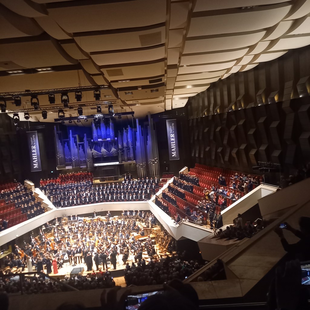 Certainly everything seemed fully alive in this performance, where things came spectacularly together, and I thought it had to be the best I’ve ever heard live. The combined forces of the various choruses weren’t huge (see picture) but, given the acoustics of the hall, they sounded wonderful anyway –from where I was sitting the men sounded slightly stronger than the women, because all the men were in the middle of the choir seats in front of the organ, while the women extended to the wings on either side. The children – including the Thomaskirche boys’ choir – sounded very clear. The orchestra played extraordinarily well, sounding particularly sumptuous. The soloists for the most part sounded great, though the tenor seemed to be straining occasionally – the ones well-known to me, Emily Magee and Georg Zeppennfeld, were also those who stood out as soloists. .